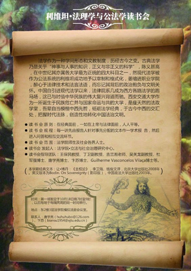 基于以上种种考量,并配合学校“思想交大”建设和学院法理学和公法学的学科建设,华体网页版登录“立法与社会治理研究中心”发起创办“利维坦·法理学与公法学读书会”系列活动。本学期该活动选取的经典文本为让·博丹的《主权论》,并于10月18日晚7时在学院会议室举行了首场活动,华体网页版登录丁卫副教授、吉兰湘老师、彭何利博士、苏青博士、王朝恩博士、卞苏博士、唐学亮博士等10余位师生参加。主权理论是现代民族-国家兴起的理论前提,而民族-国家又是现代社会最重要的一个政治与法律现象,并与中国近代以来持续至今的伟大而艰难的国家转型勾连起来,因此,不得不察。在该场读书会活动中,主讲教师唐学亮针对博丹《主权论》一书的“导论”部分,就“为什么读博丹?”、“怎么读博丹?”、“博丹的思想里程与理论建构”以及“博丹理论的缺陷”等四个方面做了一个提纲挈领而又不失理论深度的学术报告。之后,就报告的内容及书中所启示的一些重大理论与现实问题,与会人员各自发表了自己的看法,并展开了热烈的讨论。首场读书会活动取得了预期的效果,我们将在两周后的同一时间举行第二场活动。“路漫漫其修远兮,吾将上下而求索”!