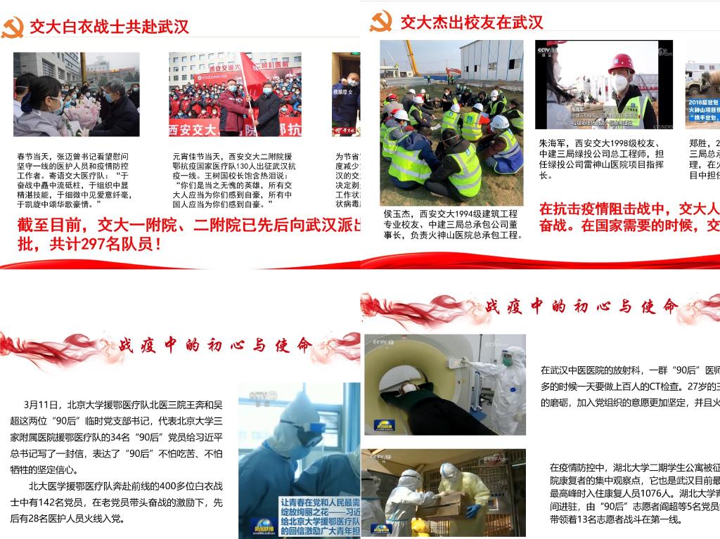 学先进事迹,做有担当的青年。硕9158党支部在疫情期间注重收集、宣传新时代青年的先进事迹:学习交大援鄂医疗队、交大杰出校友的奉献精神,传递交大人高扬的“爱国主义、集体主义、英雄主义、乐观主义”旗帜精神;学习奋战在一线的青年党员不畏艰险、舍生忘死的先进事例,立志在自己今后的道路上发扬“西迁精神”、不忘初心、爱国奉献。