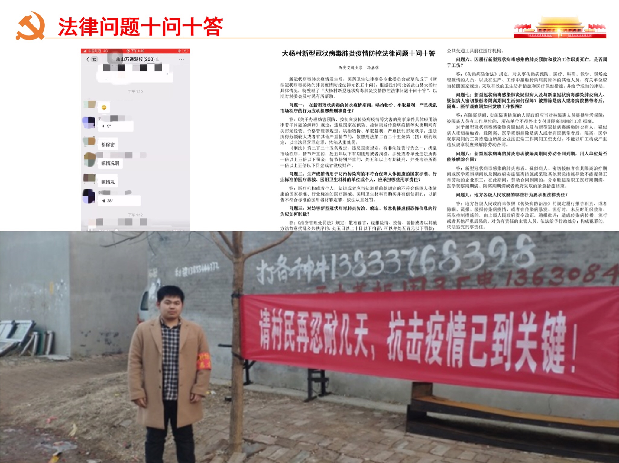 支部孙嘉学同志在疫情期间投身基层志愿活动,参与街道喷洒消毒液、设置进村路口路障、保障水果蔬菜鸡蛋肉质食品和医疗用品进村等多项工作,同时,他还利用专业所长,结合身边村民关心的热点法律问题,制作《大杨村新型冠状病毒肺炎疫情防控法律问题十问十答》进行普法。