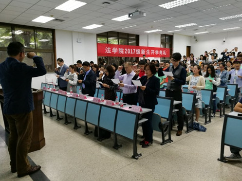 最后,全体新生在丁卫副院长的带领下庄重誓言:“公平所系,正义相托。在这庄严时刻,我郑重宣誓:我自愿投身法治事业,忠实履行一个法律人应尽的全部义务,恪守宪法,热爱祖国,忠于人民,弘扬法治精神,维护正当权益,勤勉诚信,清正廉洁。我决心竭尽全力,捍卫法律职业的圣洁与荣誉,养天地正气,行人间正道,求正义,尚卓越,为法治中国的繁荣发展和人类正义的美好未来奋斗终身!”典礼在铿锵的誓词声中圆满结束。