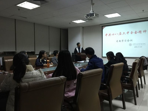 11月3日晚,华体网页版登录党总支召开党支部委员集体学习会,传达党的十八届六中全会精神,学习《关于新形势下党内政治生活的若干准则》、《中国共产党党内监督条例》以及习近平总书记在十八届六中全会上关于《准则》和《条例》的说明。华体网页版登录一个教工支部和六个研究生支部的全体委员参加了集体学习。会议由党总支书记王保民教授主持。