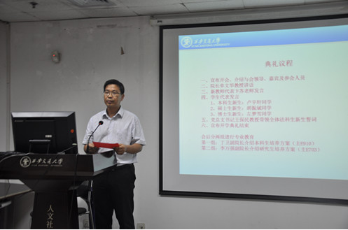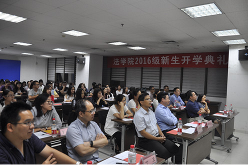 9月18日晚,华体网页版登录2016级新生开学典礼在主E703隆重举行。院长单文华教授,党总支书记王保民教授,副院长李万强教授,副院长丁卫副教授,院长助理吉兰湘老师和苏金远教授,院工会主席张弘副教授,文治书院院务副主任郭小平老师,院办主任张美萍老师,法学复合51班班主任薛华、唐学亮老师,法学61班班主任王玉苹、卞苏老师以及全体2016级本科、硕士、博士生新生参加了开学典礼,会议由学院学生工作专职委员张乃钟老师主持。