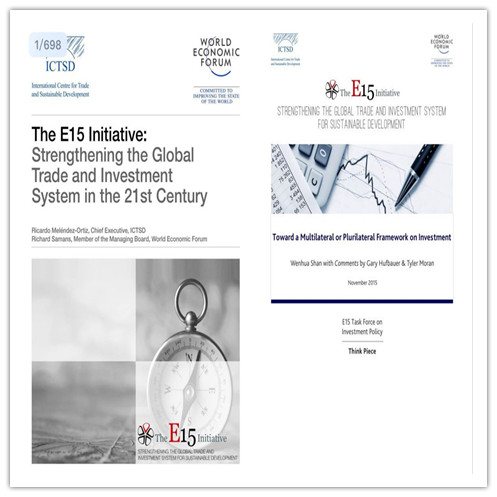 2008年金融危机后世界贸易增速显著放缓。全球贸易对收入增长的贡献率也骤降至一半,因此一个有效的全球贸易和投资机制对于重振经济增长和应对21世纪的全球挑战至关重要。但目前的体系,虽在某些方面运作良好,却在不少领域已经过时,亟需更高程度的政策连贯性。正是基于这样的现实,世界经济论坛联合贸易和可持续发展中心和其他16个合作机构发起了E15倡议(E15 Initiative),集中世界顶级专家,研讨未来十年全球投资贸易的政策难题和政策取向。在此倡议下,世界经济论坛于2012至2015年间,组织全球375名顶尖专家进行了80多次互动式的对话。E15倡议的核心是15个主题专家组和3个工作小组,每组都汇集了来自全球不同领域和背景的顶尖智库专家,并最终形成了150多项审视全球贸易和投资体系的挑战与机遇的政策分析报告。
