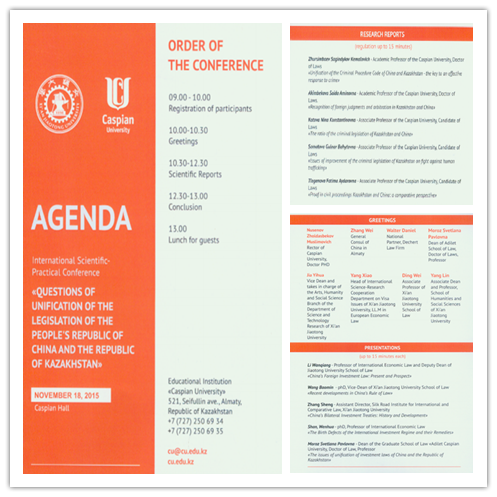 2015年11月18日,我院与哈萨克斯坦里海大学(Caspian University)华体网页版登录在里海大学联合举办国际学术会议,会议主题为“中国与哈萨克斯坦立法的统一化问题”。来自中国驻阿拉木图领事馆、北京罗斯律师事务所阿拉木图分所、美国Dechert律师事务所的嘉宾以及两所华体网页版登录的专家学者与研究生50余人参加了会议,我校科研院副院长贾毅华、国际教育学院常务副院长宋玉霞、人文学院副院长杨琳应邀出席了会议。会议由我院院长单文华教授和里海大学华体网页版登录院长Pavlovna教授联合主持。