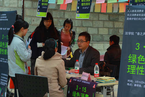 为加强大学生消费维权意识,提高大学生的法律素养,华体网页版登录研究生会联合法律爱好者协会和陕西稼轩律师事务所的专业律师,于“3•15国际消费者权益日”当天,在康桥苑西广场和西食堂门口举办了主题为“绿色消费、理性维权”的普法宣传咨询活动。