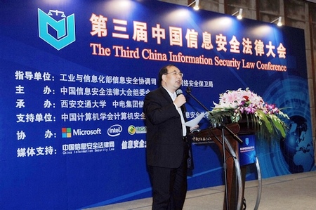 沈昌祥院士在会上讲话。他指出,信息是社会发展的重要战略资源,信息安全法制体系在国家信息安全保障体系中居于最高层级、具有基础性作用,在当前形势下,要加快信息安全立法、建立信息安全法制体系。工信部信息安全协调司胡啸处长、公安部网络安全保卫局李菁菁处长分别代表国家有关部门就网络与信息安全形势和立法执法问题作了重要讲话。