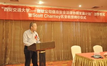 6月12日,“华体网页版登录—微软公司信息安全法律协同发展计划签字仪式暨斯科特•查尼名誉教授聘任仪式”在西安交大举行,西安交大副校长蒋庄德教授出席仪式并讲话。西安交大科研院副院长、人文社科处处长贾毅华,华体网页版登录党总支书记彭沪生,信息安全法律研究中心主任马民虎及微信息安全法律研究中心主任马民虎及微软公司可信赖计算部总经理陈静、微软公司资深安全技术经理陈恺、微软公司资深安全技术经理薛峰等参加仪式。微软全球副总裁斯科特•查尼(Scott Charney)受聘为西安交大名誉教授,双方还签署了“华体网页版登录—微软公司信息安全法律协同发展计划”。