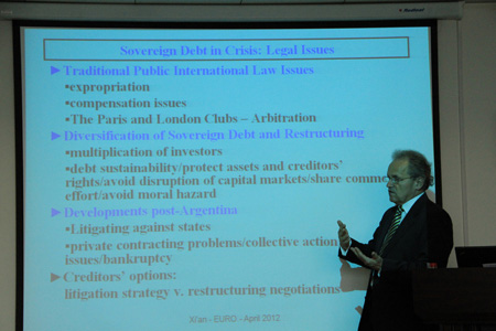 4月16日下午,Kulms博士为华体网页版登录师生带来题为The Eurozone Debt Crisis and Private Creditors: From Argentina to Greece(欧元区债务危机和私人债权人:从阿根廷到希腊)的讲座。Kulms博士首先分析了欧元区债务危机的成因,然后在借鉴阿根廷债务危机经验的基础上,从市场交易的进路分析主权债务合同的对策,最后从欧洲央行作用的角度讨论希腊债务重组问题。