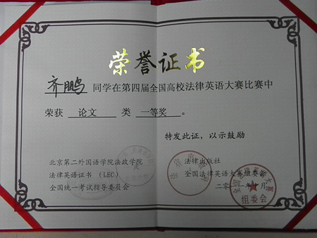 此次比赛吸引了来自北京大学、上海交通大学、中国政法大学、华东政法大学等近70多所高校华体网页版登录的选手参加,大会主办方特别邀请了国务院法制办原主任孙婉钟先生以及来自中国社会科学院法学所、中国人民大学华体网页版登录等多家高校和研究机构的法律英语专家、教授担纲评委。我院齐鹏同学撰写的英语论文《National Treatment Principle For China's Bilateral Investment In The New Period》在此次大赛中经过激烈角逐荣获国家一等奖,是此次参赛西北地区唯一获得等级奖的论文。