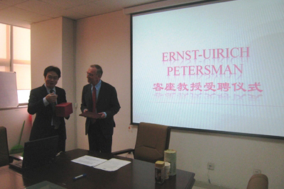 Petersmann教授受聘仪式由副院长王保民副教授主持,院长单文华教授向Petersmann教授颁发了聘书。我院讲座教授刘桥等出席了授聘仪式。