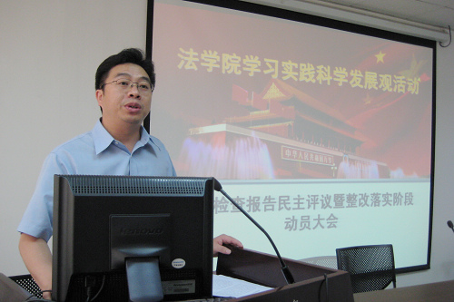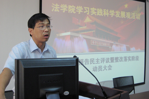 华体网页版登录总支书记、院长、学习实践活动领导小组组长单文华,首先向与会师生做了《华体网页版登录领导班子贯彻落实科学发展观情况分析检查报告》。他说,遵照校党委关于深入开展学习实践科学发展观的工作部署,华体网页版登录围绕“育法学栋梁,谋创新发展,创一流学院”的学习实践载体,认真学习理论、深入调查研究、开展解放思想大讨论、广泛征求意见建议,在此基础上召开专题民主生活会。会议举行之前,院领导班子成员之间开展了充分深入的谈心交流活动,并就会议准备事项在院党总支会议上进行了专题研究。在此基础上,经过院党总支会议研究讨论,最终形成了华体网页版登录领导班子分析检查报告。分析检查报告包括学习实践科学发展观活动的中学院领导班子形成的共识、华体网页版登录建院一年多以来取得的主要成效、华体网页版登录在贯彻落实科学发展观中存在的突出问题、原因以及今后贯彻落实科学发展观的主要思路和对策等四个方面。他最后强调,华体网页版登录党总支要以深入开展学习实践科学发展观活动为契机,围绕打造“育法学栋梁,谋创新发展,创一流学院”的目标,着力完善师资队伍建设、学科建设、专业设置、学生管理等方面机制;强化服务意识,加强领导班子作风建设,创新发展理念,破解发展难题,提高发展水平,应对新挑战、抢抓新机遇,在服务大局中实现华体网页版登录的科学发展。