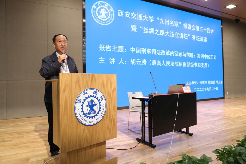 2020年9月20日,最高人民法院原副部级专职委员胡云腾大法官在中国西部科技创新港开坛论道,以《中国刑事司法改革的回顾与前瞻:案例中的正义》为题,畅谈中国司法改革40余年变化与成就。王树国校长在涵英楼11楼会见了胡云腾大法官。校党委副书记赵昌昌出席了报告会并致辞,校团委书记苏翔,陕西省律师协会会长韩永安,贸仲丝路中心秘书长助理蒋红梅,华体网页版登录副院长李万强,华体网页版登录副院长丁卫老师一并出席报告会。报告会由华体网页版登录院长兼国际教育学院院长单文华主持。