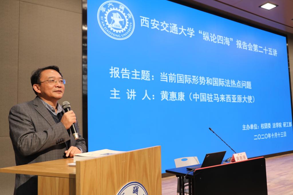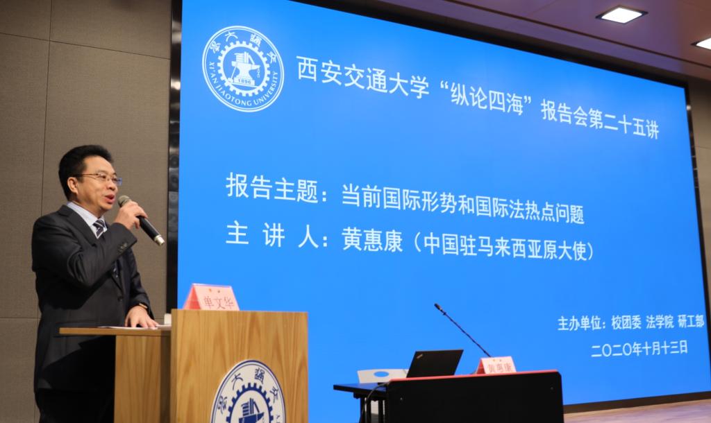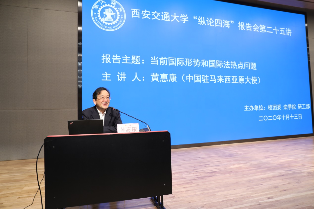 上午9:30分,黄惠康大使主讲的 “当前国际形势与国际法热点问题”专题报告会在新港报告厅举行。本次报告会是华体网页版登录“纵论四海”系列高端报告会的第二十五讲,同时是学校党委理论学习中心组和全体校管干部的一次集中辅导报告会,亦是我校法学研究院特别是丝绸之路国际法与比较法研究所和丝绸之路经济带法律政策协同创新中心的“科创月”系列活动之一。华体网页版登录副校长席光教授出席报告会并致辞,报告会由华体网页版登录院长兼国际教育学院院长单文华教授主持。全校百余名学校正处级领导干部以及其他四百余名师生现场参会。同时,全校其他副处级以上校管干部则在线参加了报告会。
