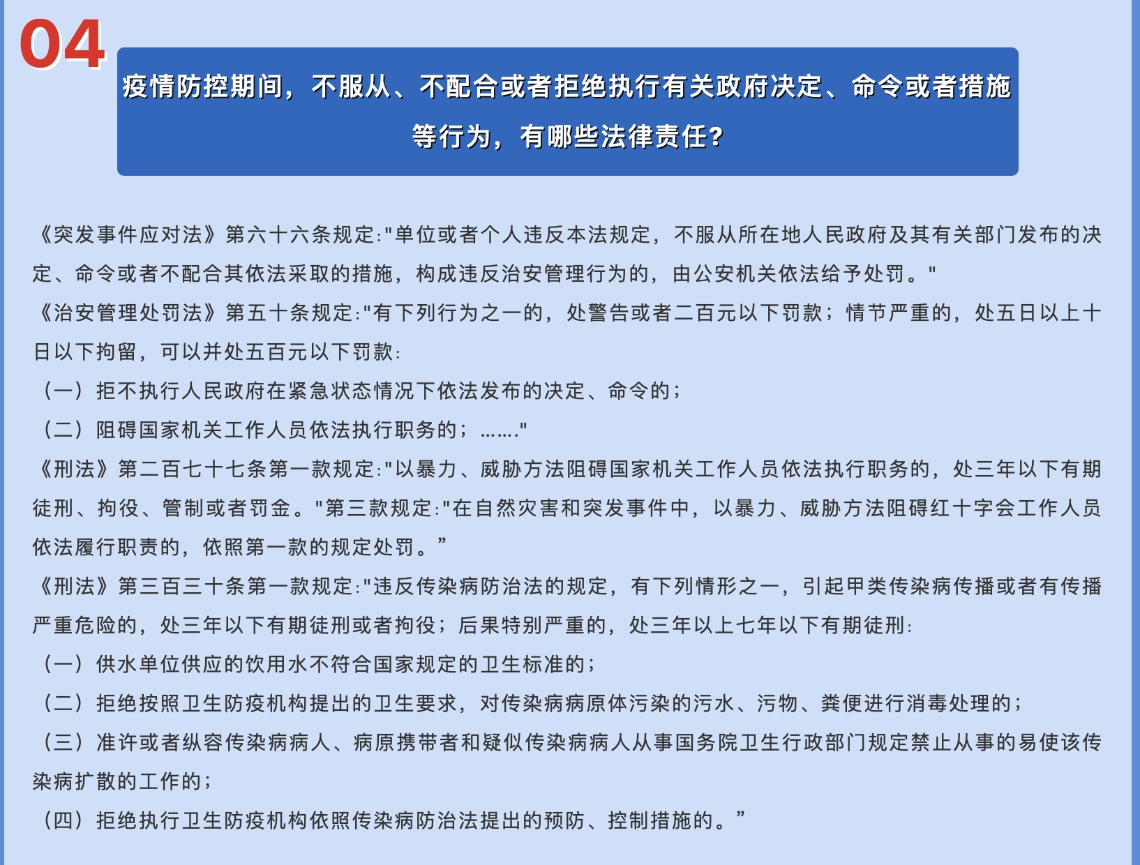 普法问答涉及疫情期间的出行聚集、具体防护、信息传播、与医护人员的配合等等方面,设想可能出现的情况与场景,为大家清楚地划定了疫情防护期间的行为边界,从而进一步促进与提高广大群众的法律意识,更加积极正确地配合防疫抗疫工作。