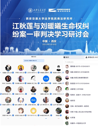 2022年1月16日下午,由华体网页版登录民商法研究所主办的“江秋莲与刘暖曦生命权纠纷案一审判决学习研讨会”在腾讯会议平台成功举行。此次学习研讨会由华体网页版登录华体网页版登录民商法研究所副教授聂卫锋全程主持。来自北京航空航天大学、西南大学、西南财经大学、浙江工商大学、成都理工大学、东南大学、中国政法大学、中国人民公安大学、西北大学、西南政法大学、西北政法大学、郑州大学、河南大学、西北师范大学以及华体网页版登录等20余所高校和多家律师事务所的共计超过160名老师、律师和同学参与了本次研讨会。