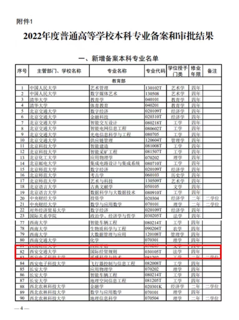 近年来,随着“一带一路”建设持续推进和全球治理中国方案的渐次提出,社会各界对能够参与国际经贸规则制定和综合运用的专门性法治人才的需求大幅提升。因应这一全新形势,西安交大深入调研人才需求情况,分析自身学科优势和专业特色,咨询专家学者的意见建议,积极申请增设国际经贸规则本科专业,拟为涉外卓越法治人才培养贡献力量。经过函评论证、学校两轮专家会评多个环节,最终顺利通过教育部审查备案,近期即将启动专业招生。