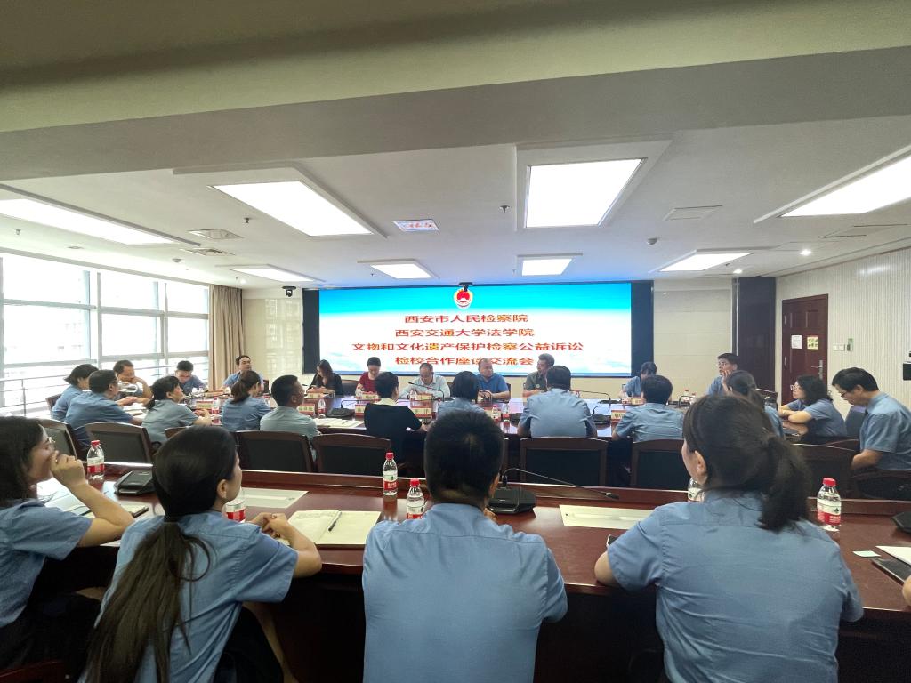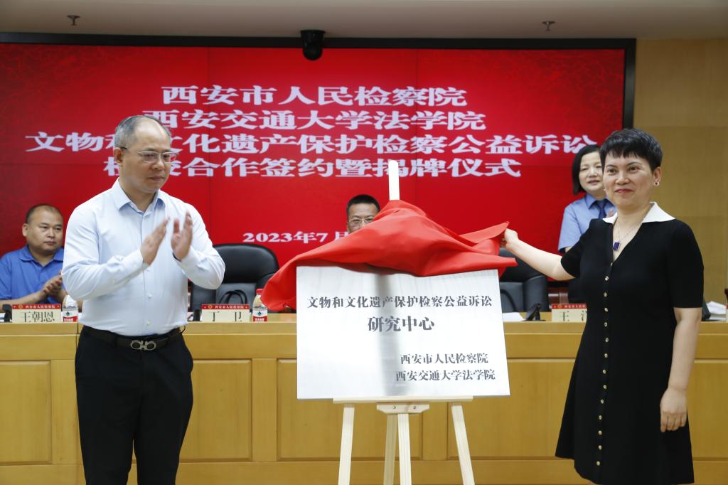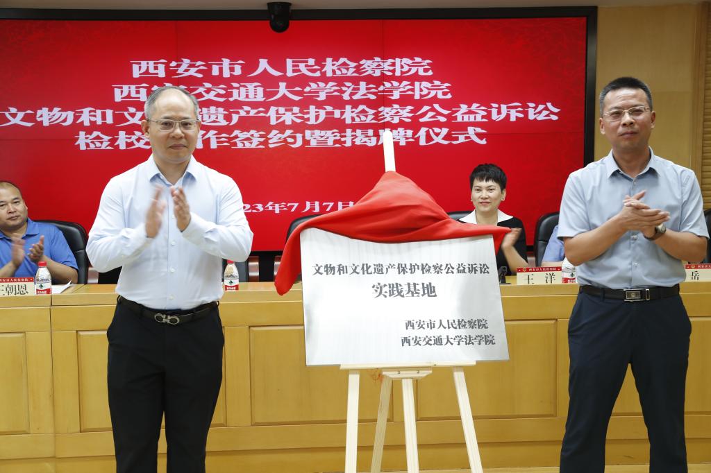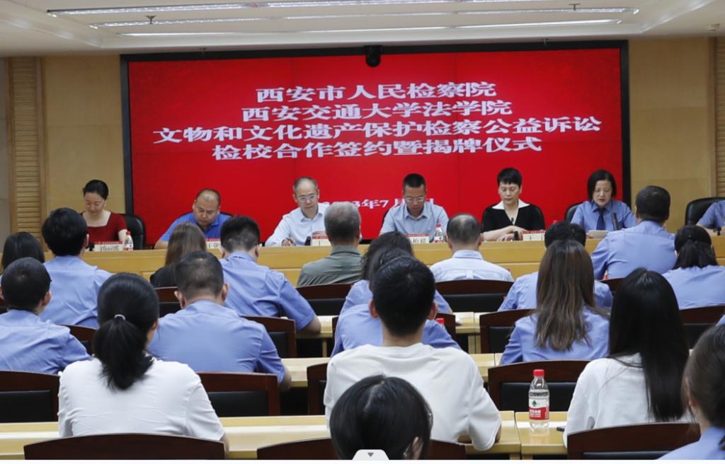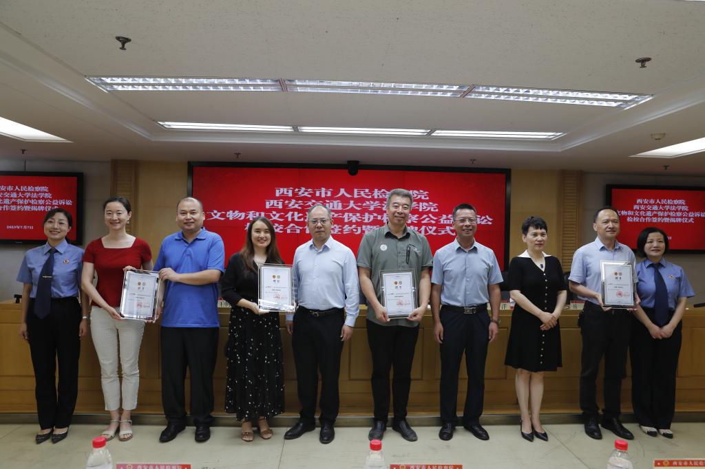 7月7日,西安市人民检察院、华体网页版登录华体网页版登录共同举办“文物和文化遗产保护检察公益诉讼”检校合作签约暨揭牌仪式。陕西省人民检察院第八检察部主任王洋、西安市人民检察院副检察长韩柏超等领导,西安市人民检察院第八检察部全体干警、各区县院分管副检察长、公益诉讼部门负责人及实务研究员、华体网页版登录华体网页版登录副院长丁卫、华体网页版登录华体网页版登录的王朝恩研究员、刘丽娜副教授、特聘专家研究员代表以及西交大华体网页版登录首批11名实习生出席仪式。