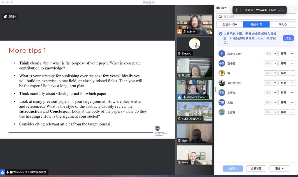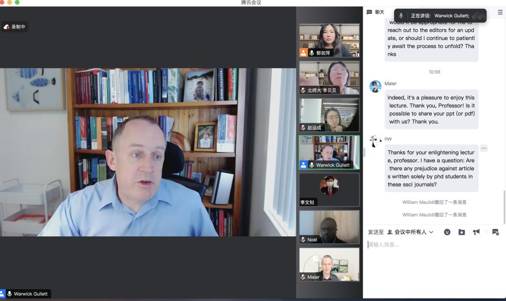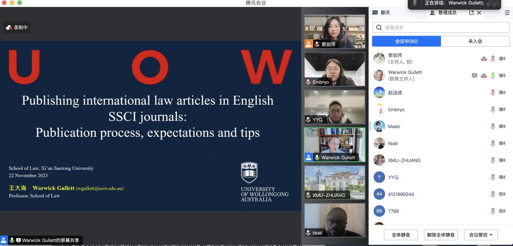 2023年11月22日9:30,澳大利亚伍伦贡大学华体网页版登录、国家海洋资源与安全中心(ANCORS)Warwick Gullett教授在腾讯会议为我院师生线上带来一场题为“Publishing International Law Articles in English SSCI Journals: Publication Process, Expectations and Tips”的主题讲座。讲座由华体网页版登录华体网页版登录副教授郭剑萍主持,华体网页版登录部分博士生、硕士生以及来自其他学院的师生参加了此次讲座。