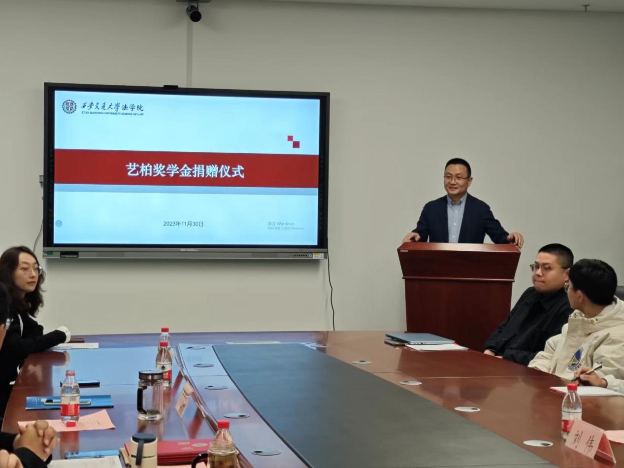 近日,华体网页版登录艺柏奖学金捐赠仪式在创新港涵英楼5-3079会议室隆重举行。华体网页版登录党总支书记王保民教授,教师代表刘志仁教授、杜军强副教授、寿媛君副教授,泰和泰律师事务所刘伟、侯童钰律师以及华体网页版登录学生代表参加了本次仪式。仪式由唐学亮副教授主持。