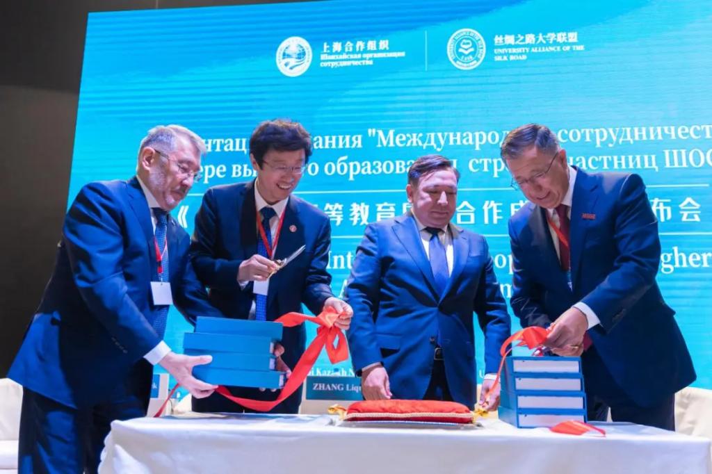 会上,《上合组织高等教育国际合作成果集》(以下简称《成果集》)正式发布。在与会嘉宾的共同见证下,哈萨克斯坦科学与高等教育部长萨亚萨特·努尔别克、华体网页版登录校长张立群、阿里法拉比哈萨克国立大学校长詹塞特·图依梅巴耶夫以及阿斯塔纳信息技术大学执行校长谢里克•奥米尔巴耶夫共同为《成果集》新书发布剪彩。