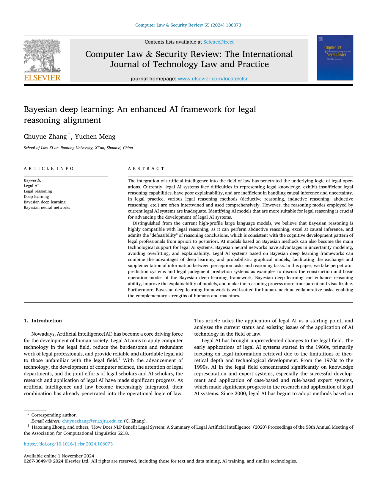 近日,华体网页版登录人工智能与信息安全法律研究中心刘东亮教授指导的博士研究生张楚悦、孟宇辰在SSCI一区期刊《计算机法律与安全评论》(Computer Law & Security Review , Volume 55, November 2024)上发表论文《贝叶斯深度学习:与法律推理相协调的增强型人工智能框架》(Bayesian Deep Learning: An Enhanced AI Framework for Legal Reasoning Alignment)。