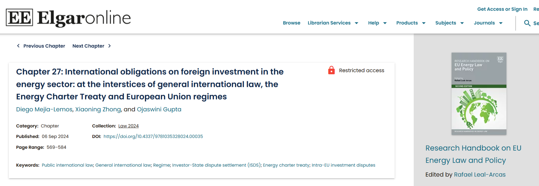 ‘International Obligations on Foreign Investment in the Energy Sector: at the Interstices of General International Law, the Energy Charter Treaty, and European Union Regimes,’ in Rafael Leal-Arcas (ed),Research Handbook on EU Energy Law and Policy(2nd ed, Edward Elgar, 2024) 570-585 (co-authored with Xiaoning Zhong and Ojaswini Gupta)