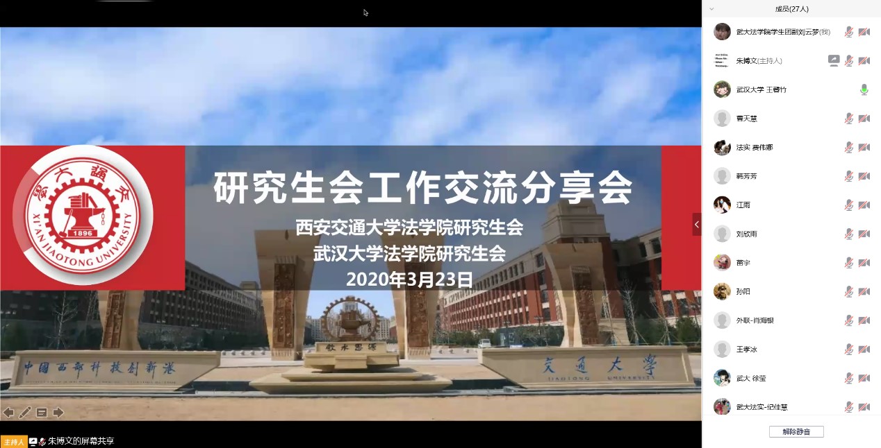 会议伊始,两院研究生会就组织建设、日常工作、精品活动、战疫工作等方面进行了交流。朱博文结合演示文档,图文并茂地向武大同学们介绍了西安交大华体网页版登录研究生会的基本情况,研会作为学院党总支领导、团工委指导的综合性学生组织,是学院联系广大同学的桥梁和纽带,从文体、宣传、学术、心理等多个方面为同学们提供全面服务。根据团中央有关文件精神,学院去年对研会组织进行了精简,目前设主席、副主席各一人,分设组织部、宣传部与文体部三个部门,由研会主席、副主席以及部长共同管理,全体干事民主参与。研会先后举办了新港杯辩论赛、法律知识竞赛、冬至饺子宴、迎新冷餐会、元旦嘉年华以及疫情期间的“春之声”法律文化节等精品活动,受到同学们的广泛参与和高度评价,在校内外显著提升了学院的影响力。研会通过对外加强与兄弟院系研会的沟通协调,联合举办大型活动;对内与学院各党支部密切合作,由支部吸收动员入党积极分子参与活动,有效克服了交大华体网页版登录学生规模较小,研会部门精简、人力有限对开展活动的制约。