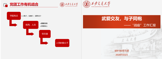 随后的党团工作交流环节,两院有关负责同学分别介绍了党团组织在抗疫期间的主要工作。交大华体网页版登录硕9160党支部书记孙阳表示,华体网页版登录各支部积极响应习近平总书记重要指示,落实党中央国务院决策部署,对标学校、学院防控要求;加强防疫宣传教育,引导学生带头守法;畅通信息报送渠道,保障日报制度运行;分享线上学习资源,配合做好线上授课筹备工作,号召同学在导师指导下深入研究疫情相关法律问题;倡导党员服务社区,组织党员捐款捐物。武大华体网页版登录团委学生副书记刘云梦表示,自疫情发生以来,学院迅速成立以党委统一领导、统一指挥的疫情防疫工作小组,形成了党总支、党支部、党员个人三级联动的有力防控网络,从理论学习、思想引领、基层服务多领域开展抗疫工作。团支部积极响应,组织学习“青年大学习”团课,开展主题团日活动,鼓励团员青年积极投身防疫工作,发挥团员的生力军作用。