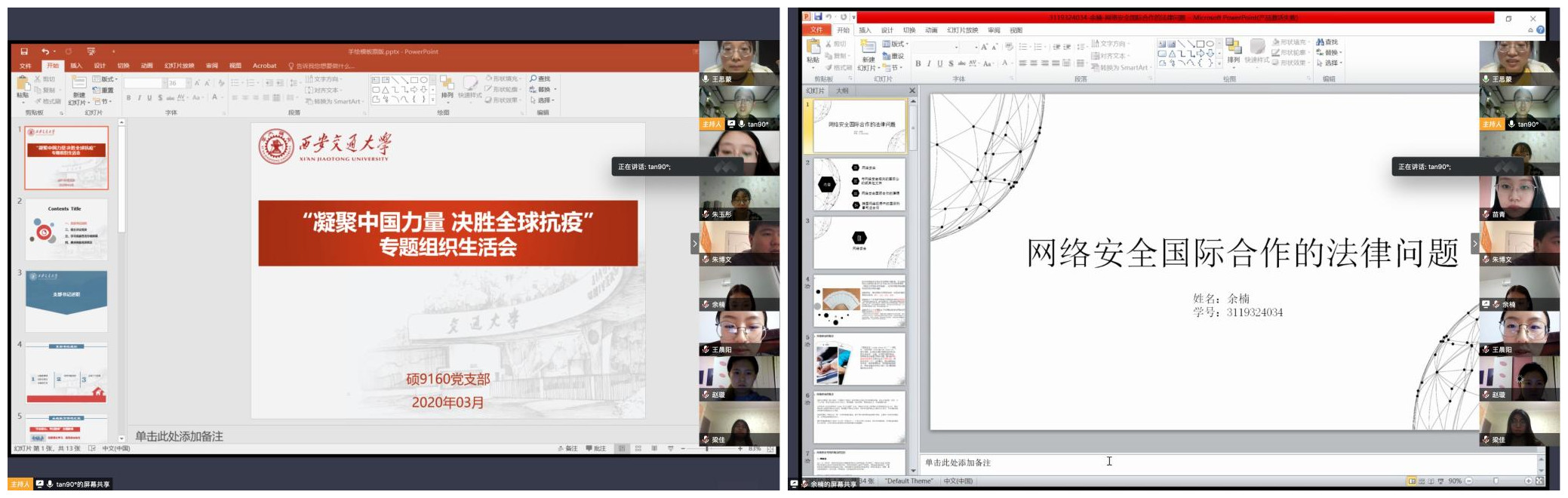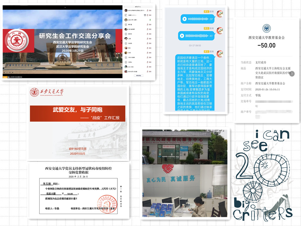 3月23日晚,西安交大华体网页版登录与武汉大学华体网页版登录联合举办“武爱交友,与子同袍”分享交流会,朱博文、孙阳分别就研会建设、支部工作与武大同学分享心得、畅谈经验,两校法科学子对近期“抗疫”工作展开热烈讨论。“武大华体网页版登录研会组织健全完善,活动丰富多彩,各位同学的分享干货满满,令人受益匪浅”,支部党员、华体网页版登录研会主席朱博文表示,“我们将组织专题研究,吸收借鉴有益经验,更好地为交大同学们服务”。“武大医学部白衣执甲、坚守阵地,交大医学部逆行出征、千里驰援,共同凝聚起抗击疫情的钢铁长城”,孙阳在总结发言中表示,“待疫情散去、山河无恙之时,希望大家可以实地交流,轻抚兴庆湖畔的秦砖汉瓦,品味珞珈山上的荆风楚韵。”
