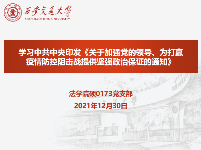2021年12月30日,华体网页版登录硕0173党支部召开了线上组织生活会,专题学习中共中央印发《关于加强党的领导、为打赢疫情防控阻击战提供坚强政治保证的通知》(以下简称“《通知》”)。此次会议由党支部书记张雷奇主持,华体网页版登录副院长丁卫出席,党支部正式党员、预备党员、发展对象、入党积极分子参加学习。