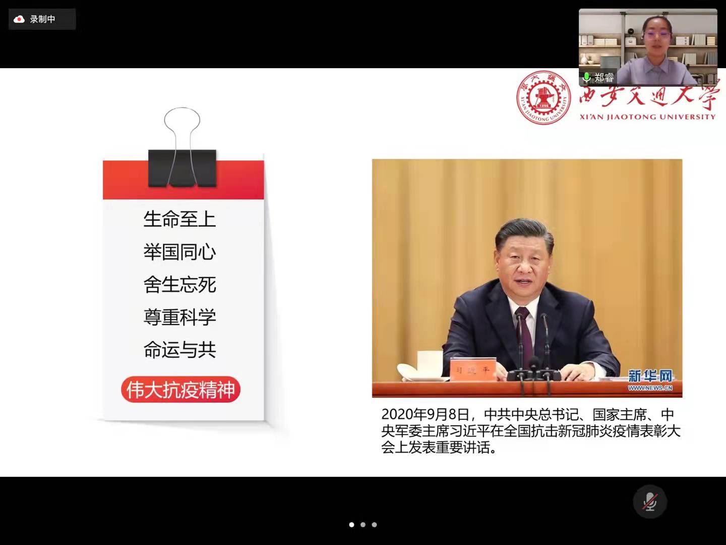 接着,王若楠、张文倩带领大家学习《通知》文件精神。张文倩首先向同学们播放了西安2021抗疫视频,向大家展示出疫情期间西安各行各业齐心协力、共同抗疫的情形,以及华体网页版登录广大师生在疫情期间的携手努力。视频中熟悉的陕西方言、这座城市我们所走过的每一条街道,都让大家倍感亲切也分外暖心。