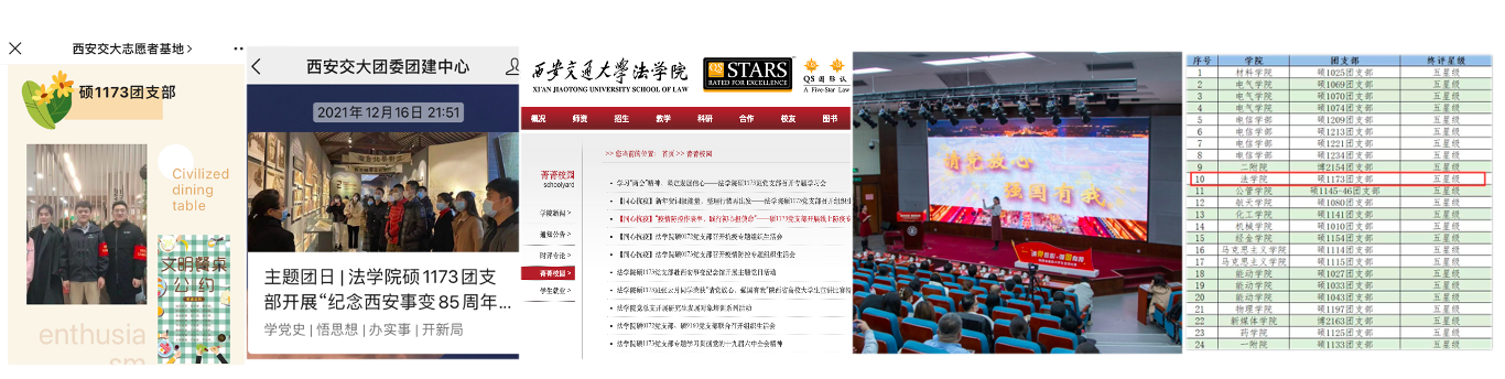 纸上得来终觉浅,绝知此事要躬行。硕1173团支部先后组织参观创新港科技展馆,了解“二次西迁”的历程和创新港发展的动态,提升同学们作为交大学子的自豪感;联合材料学院团支部,参观交大西迁博物馆,感受“西迁精神”的伟大,激发同学们爱国荣校的热情;纪念西安事变85周年,组织参观西安事变纪念馆,实地感受历史的沧桑,加深了党史学习的印象,体会到和平生活的珍贵。