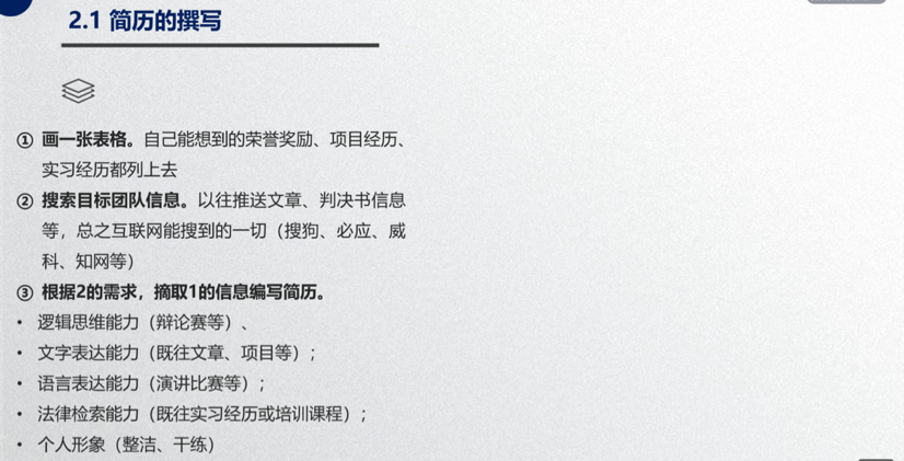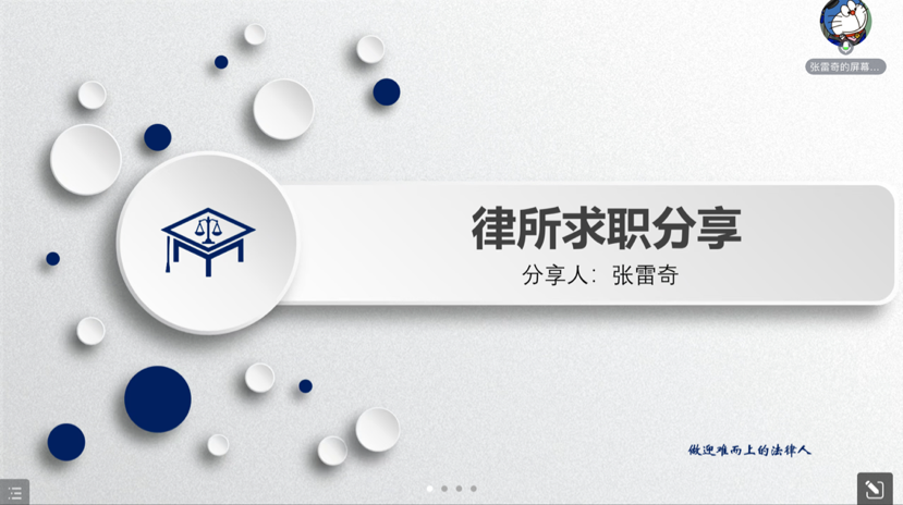第三位分享的嘉宾是已入职北京金诚同达律师事务所海关事务团队的张雷奇同学,他的分享内容包括律所的情况介绍、求职路径以及留用经验三个方面。他从自身经验出发,以详实的数据解答了同学们对于律所工作的困惑,分享了简历撰写与投递经验、工作技巧以及沟通技巧,同时建议同学们在律所工作中也要勤思考、多动笔。